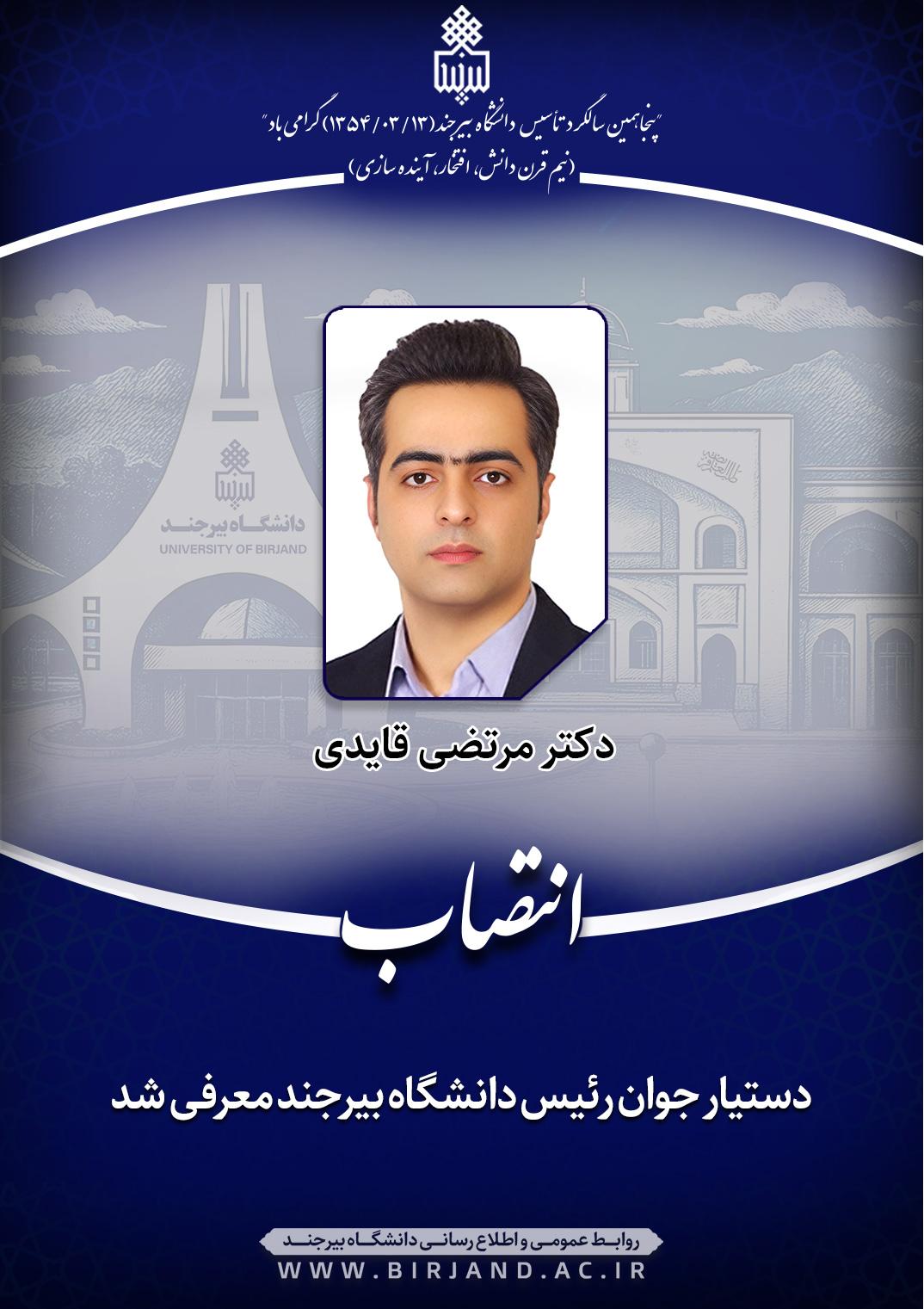 به گزارش روابط عمومی و اطلاعرسانی دانشگاه بیرجند، دکتر مرتضی قایدی، عضو هیأت علمی گروه مهندسی برق براساس نامهای از سوی دکتر خامسان، سرپرست دانشگاه بیرجند به عنوان دستیار ویژه رئیس دانشگاه به استانداری خراسان جنوبی معرفی شد.