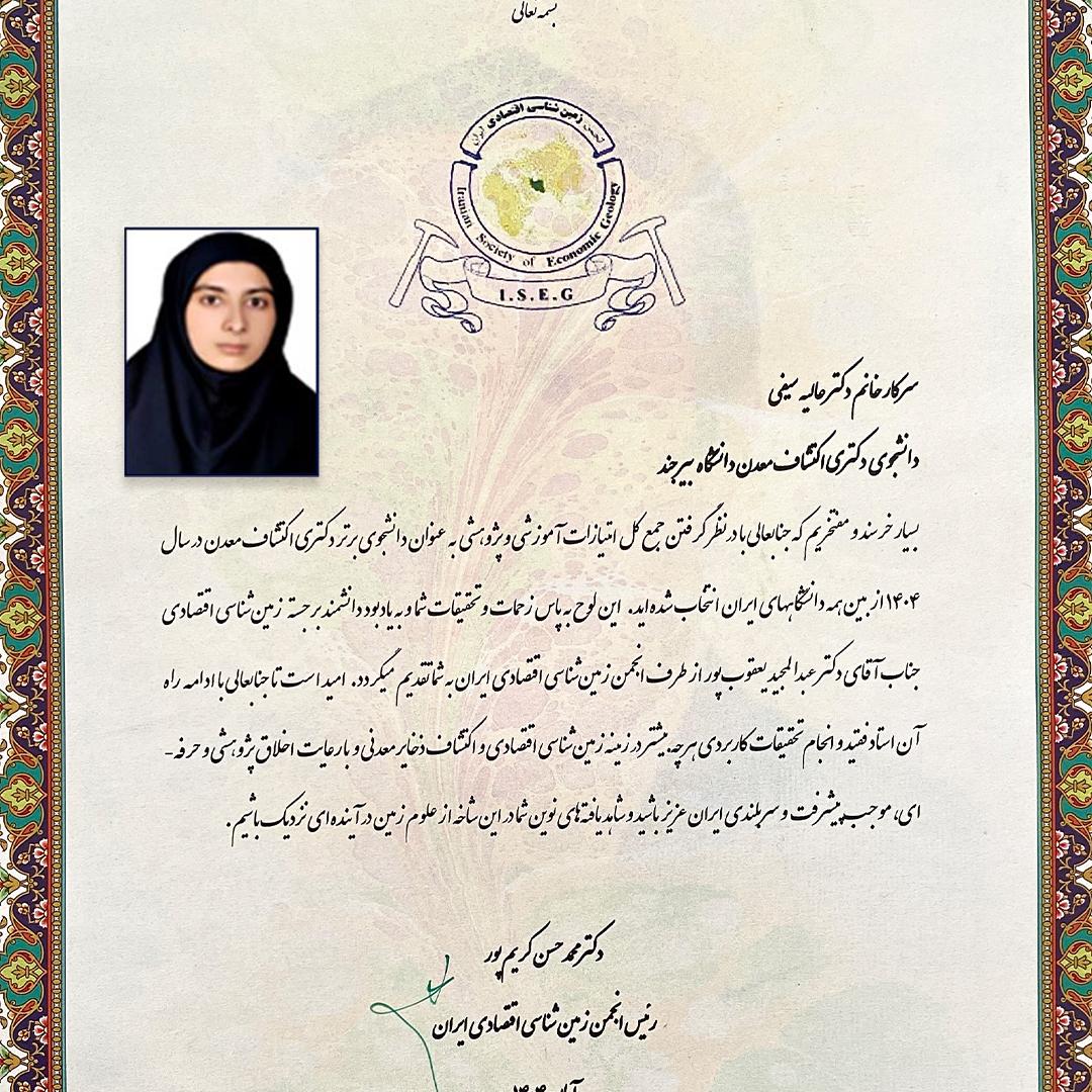 عالیه سیفی، دانشجوی دکتری مهندسی معدن گرایش اکتشاف مواد معدنی، با کسب بالاترین امتیازات آموزشی و پژوهشی، از سوی انجمن زمین‌شناسی اقتصادی ایران به‌عنوان برترین دانشجوی حوزه اکتشاف معدن در کشور انتخاب شد.