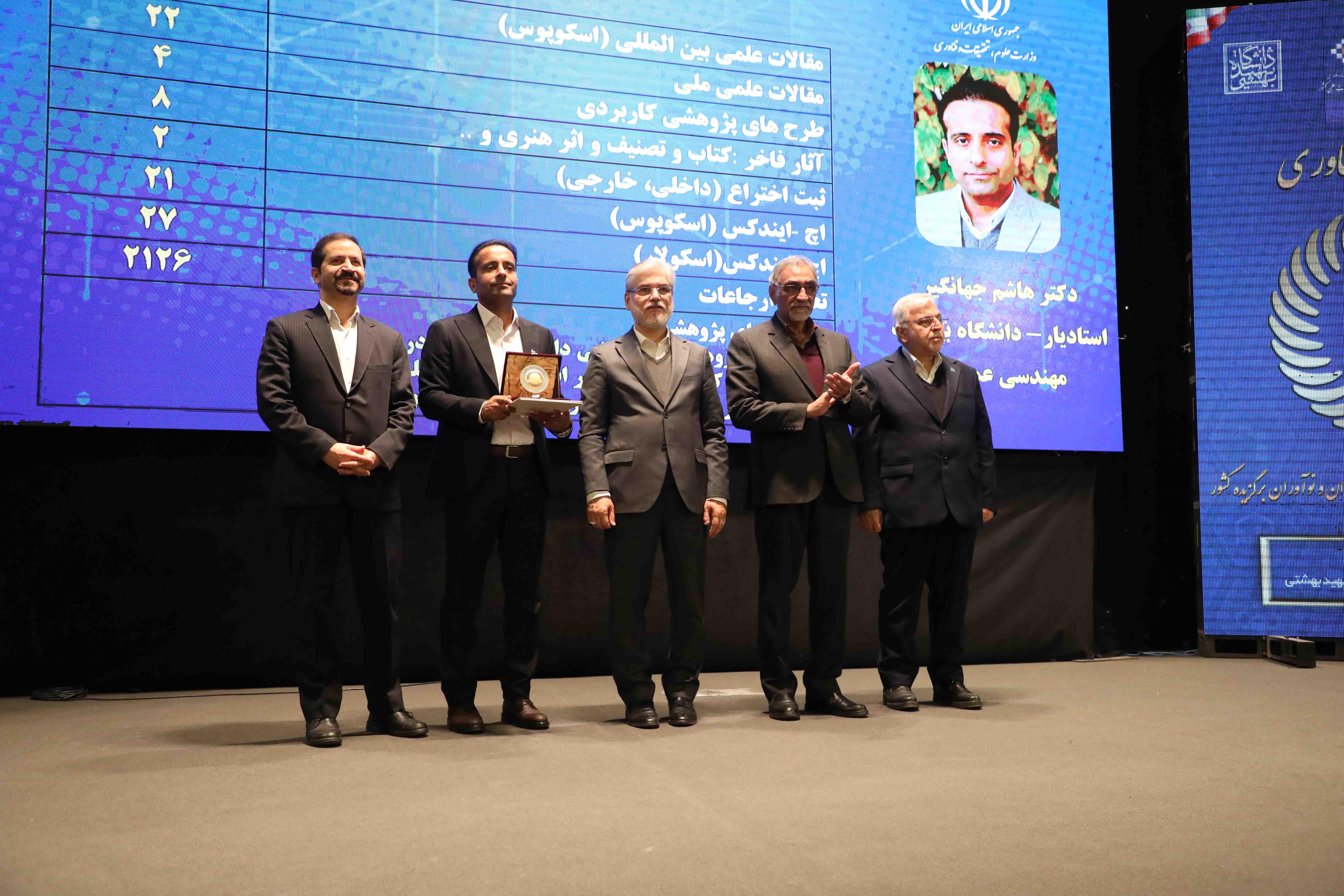 در این جشنواره ملی از دکتر هاشم جهانگیر، عضو هیأت علمی دانشگاه بیرجند به‌عنوان پژوهشگر جوان برگزیده کشور در گروه فنی و مهندسی تقدیر به عمل آمد.
